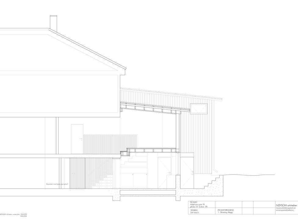 EN: Annex to a quad house in central Trondheim. The family of four living in one of the ground floor apartments needed more space, and had the choice of moving to a bigger apartment or building an annex. The annex consists of two bedrooms and an extension of the existing living room the ground floor and a new staircase that connects the basement with the upper floor. In the basement of the annex there is a self contained studio apartment, with a separate entrance, as well as an entrance to the existing basement. The annex is built mainly in wood, with a wood construction, wooden fibre insulation, wooden boards as cladding, and plywood cladding in the interior. The basement has heated concrete floors and a mix of plywood clad and bare concrete walls.